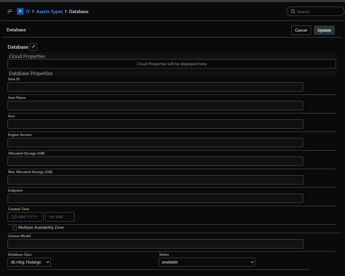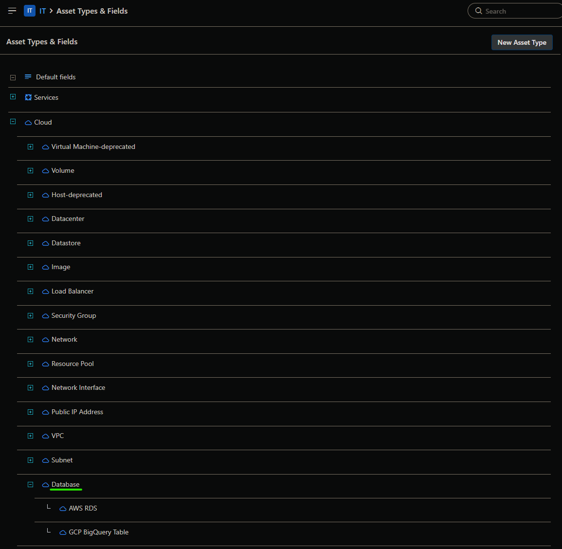 In Freshservice, in the Asset Types & Fields section you will find the asset field which will be mapped from Device42. Since the database instance example is of type Database, we locate it under Cloud-> Database. Now we can edit the Database asset type by clicking on the pencil icon all the way on the right.